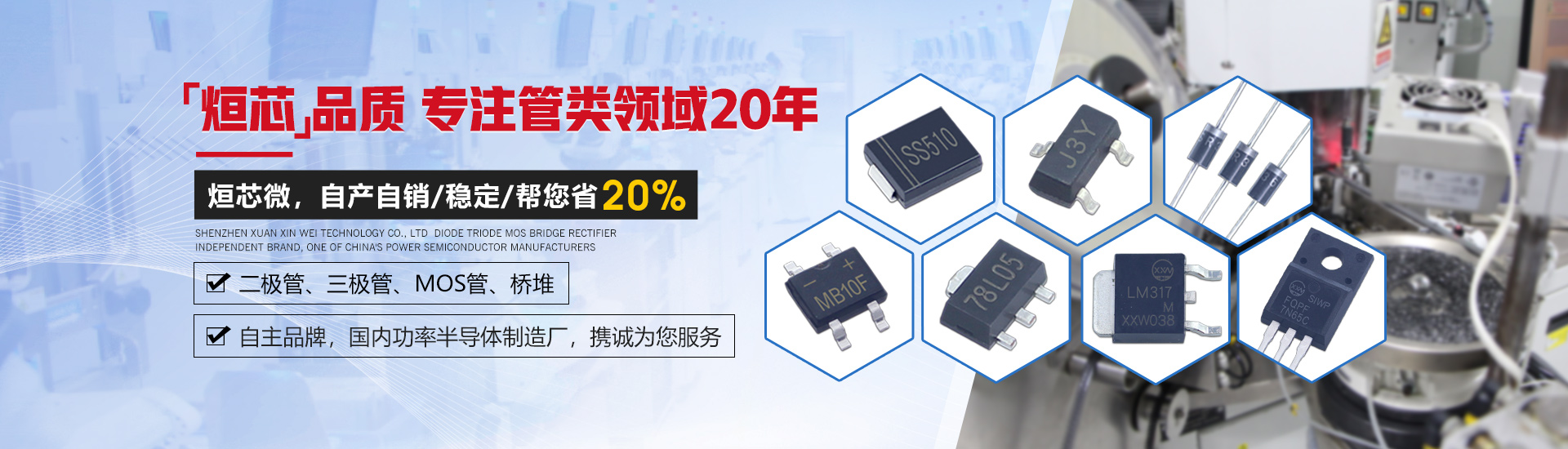 深圳市烜芯微科技有限公司是一家集研發(fā)、生產(chǎn)、銷售于一體,專注于二極管、三極管,MOS管、橋堆等功率半導(dǎo)體領(lǐng)域發(fā)展的企業(yè)。采用國際領(lǐng)先的GPP芯片生產(chǎn)工藝及一心多Die高精密制造工藝,擁有功率半導(dǎo)體器件工程實驗室,全自動高精密生產(chǎn)設(shè)備,產(chǎn)品層層把控,全程可追溯,保障了每只產(chǎn)品的卓越品質(zhì)。 產(chǎn)品封裝包括SMA,SMAF,SMB,SMBF,SMC,SOD-123,SOD-123FL,SOD-323,SOD-323FL,SOD-523,SOD-723,SOT-23,SOT-89,SOT23-3L,SOT23-5L,SOT23-6L,SOT-223,SOT-523,SOT-723,DO-41,DO-15,DO-27,DO-35,R-1,R-6,LL-34,LL-41,TO-277,TO-92,TO-92S,TO-92L,TO-126,TO-251,TO-252,TO-262,TO-263,TO-220,TO-220F,TO-247,TO-3P,TO-264,MBS,MBF,MBM,ABS,UMB,UMSB,DB,DBS,D3K,KBP,GBP,GBU,GBL,GBJ,KBL,KBU,KBJ,KBPC,KBPC6,KBPC8,KBPC-W,DNF,TSSOP-8,TSSOP-16,SOP-4,SOP-6,SOP-8,SOP-10,SOP-14,SOP-16,DIP-4,DIP-6,DIP-8,DIP-10,DIP-14,DIP-16,月產(chǎn)各封裝達(dá)6億只。 公司通過了ISO14001環(huán)境管理體系認(rèn)證,產(chǎn)品均獲得了ISO9001質(zhì)量體系認(rèn)證、UL、SGS等認(rèn)證,符合歐盟最新RoHs指令。擁有和致力于烜芯微/XXW自主品牌產(chǎn)品的推廣,提供技術(shù)支持,選型替換,cost down方案及擁有專業(yè)的生產(chǎn)管理團(tuán)隊和銷售團(tuán)隊,保證了供貨穩(wěn)定及售前選型服務(wù)等問題。 公司產(chǎn)品廣泛應(yīng)用于開關(guān)電源、適配器、逆變器、控制器、汽車電子、家用電器、通訊設(shè)備、無線充、鋰電池保護(hù)板、驅(qū)動電機、安防警報、太陽能光伏產(chǎn)業(yè)等多個領(lǐng)域。取得了國內(nèi)外眾多品牌大廠的認(rèn)可與合作,我們將堅持奉行“烜芯品質(zhì),誠信經(jīng)營,合作共贏”為公司經(jīng)營理念!竭誠為新老客戶提供優(yōu)質(zhì)的產(chǎn)品及服務(wù)。